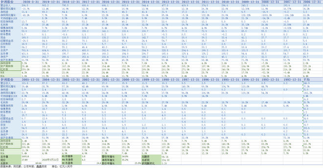 1996年上市的伊利股份,已處于成熟發(fā)展階段,其商業(yè)模式和凈利潤增長趨于穩(wěn)定。作為食品消費(fèi)板塊中乳制品龍頭,總資產(chǎn)周轉(zhuǎn)率高,但其多年平均凈利潤率只有6%,高ROE完全是由高總資產(chǎn)周轉(zhuǎn)率撐起來的。